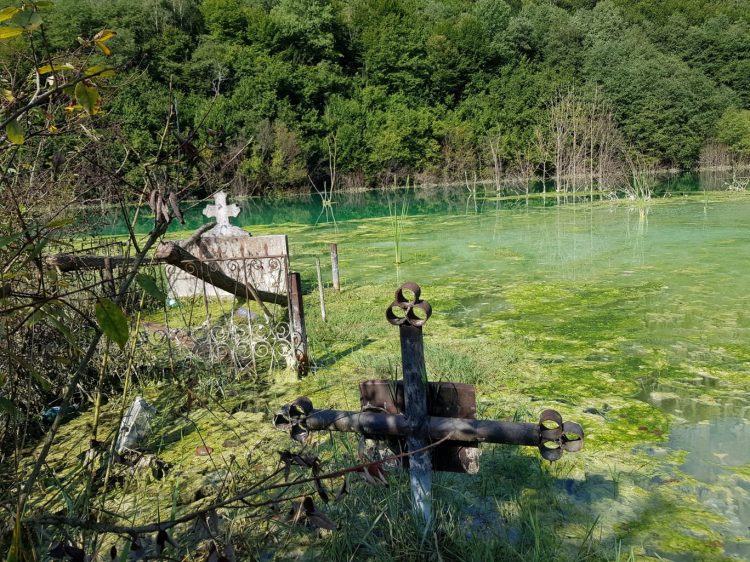 O uliță spre dreapta te duce spre vechiul cimitir. Deși inițial așezate pe unul dintre dealurile ce înconjurau satul – acum mormintele și crucile sunt înghițite rând pe rând de ape. Doar câteva dintre ele rămân să spună o poveste despre viața celor trecuți în neființă.