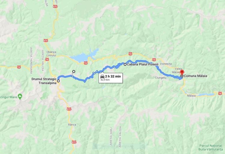 Ajuns în Plaiul Poienii, continuă coborârea spre dreapta pe Valea Rudăresei. E mult mai practicabilă coborârea pe Valea Rudăresei decât pe Valea Măceșului. Drumul pietruit te scoate în Mălaia. Din Ciungetu poți continua cu o altă secțiune off-road către Lacul Petrimanu și Cheile Oltețului. - Noi am optat pentru varianta mai grea. Nu pentru că ne credem zei, ci pentru că un localnic ne-a informat că drumul e mai bun, având în vedere faptul că a fost reabilitat de curând. Am vrut să verificăm informația și s-a dovedit a fi eronată. Ploile din ultima vreme și exploatările forestiere au rupt grav o lungă secțiune de drum.
